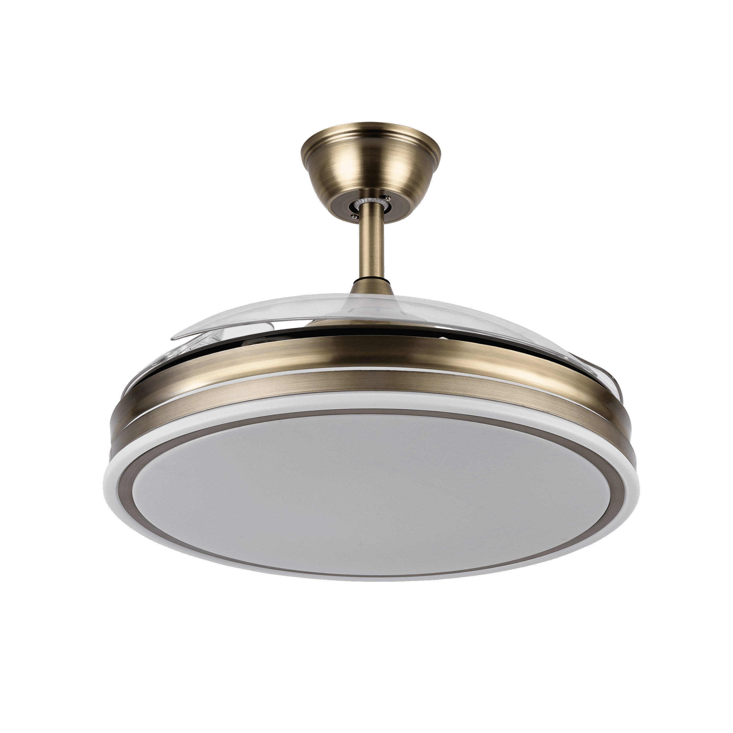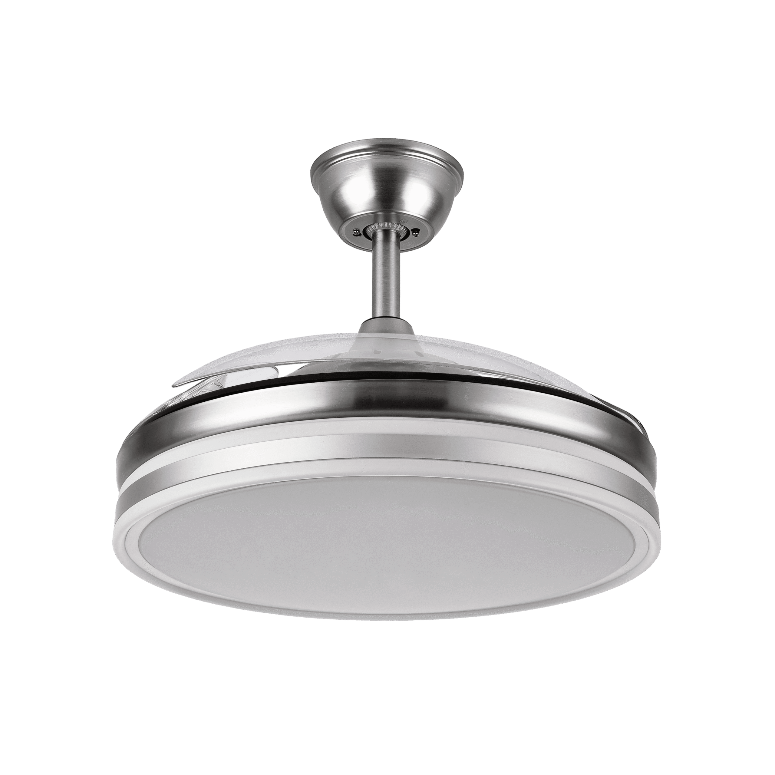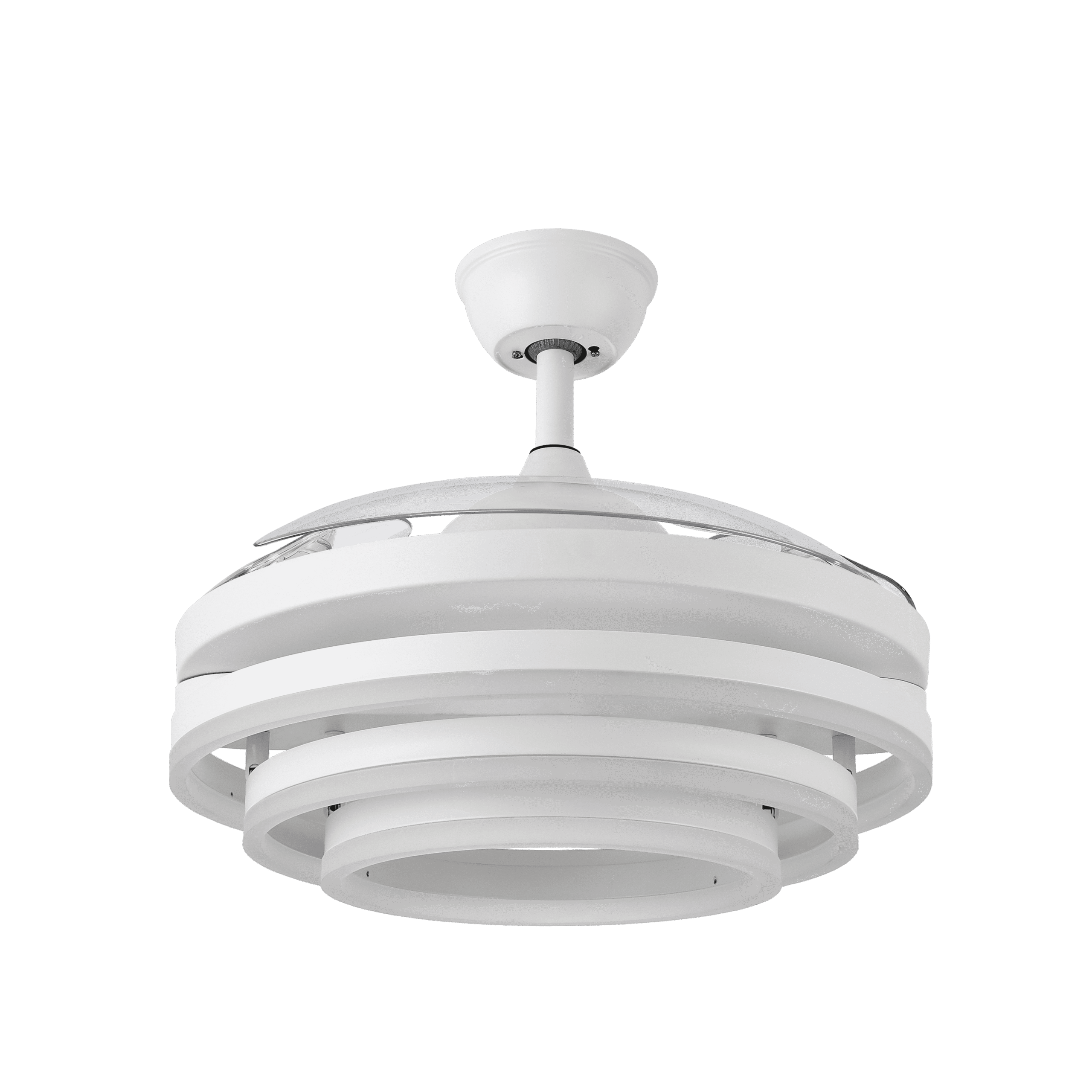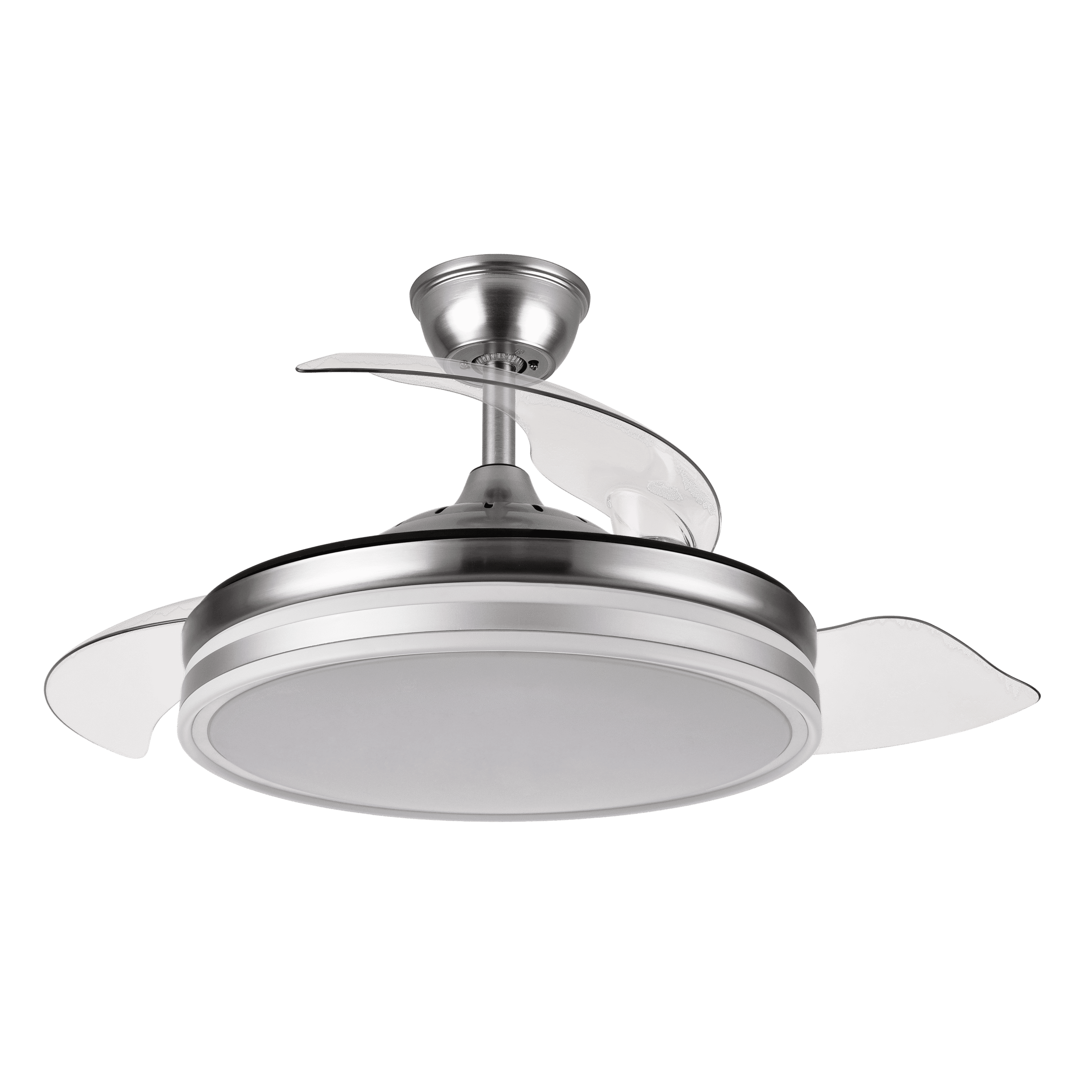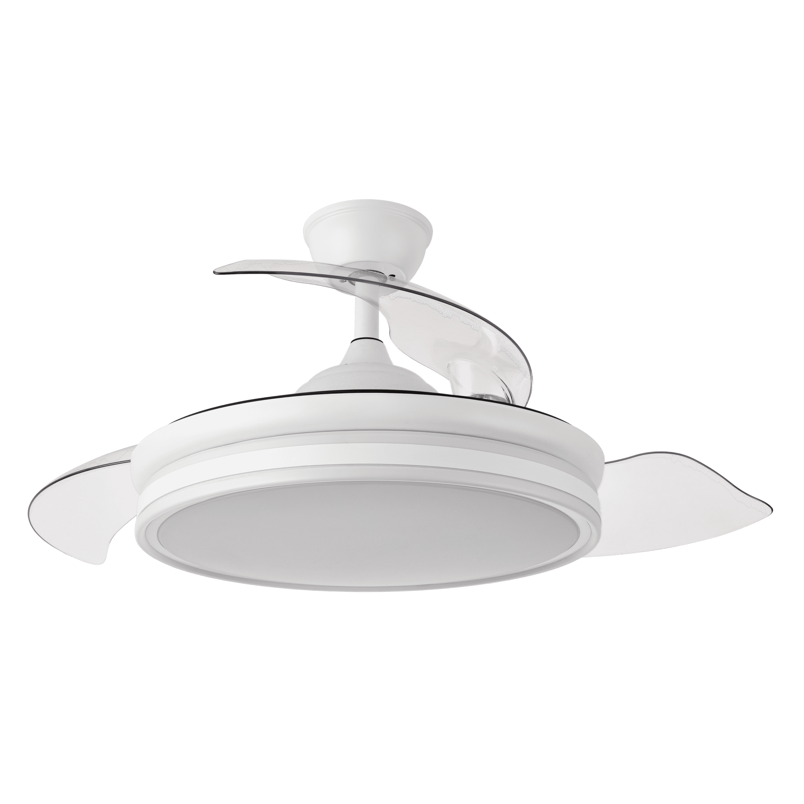 Ventilador BAYOMO realizado en metal, policarbonato y metacrilato, en color BLANCO con tres aspas DESPLEGABLES de metacrilato transparente muy resistentes. Motor DC. Tiene seis velocidades ajustables. Tecnología LED integrada con una potencia de 72W, con 3 TEMPERATURAS DE LUZ (3000-4000-6000K) y 7200 lúmenes. Control de aire verano o invierno. Su medida es de 32/47X55X55 centímetros con las aspas plegadas y de 32/47X108X108 centímetros con las aspas desplegadas, con dos medidas de tija para instalarlo a diferentes alturas. Mando a distancia INCLUIDO con MEMORIA DE COLOR incorporada y TEMPORIZADOR 1/2/4 H. Modelo también disponible en color Níquel.